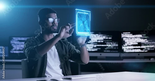 Wall mural man, programming and futuristic hologram at night on computer dashboard or software application at o - Wall murals Wall mural man, programming and futuristic hologram at night on computer dashboard or software application at o - Wall murals