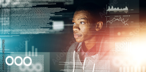 Wall mural man, web developer and coding overlay with statistics for fintech app, reporting and chart software. - Wall murals Wall mural man, web developer and coding overlay with statistics for fintech app, reporting and chart software. - Wall murals