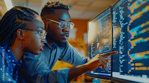Wall mural man and woman african american software developers collaborating at workplace conding at computer in - Wall murals Wall mural man and woman african american software developers collaborating at workplace conding at computer in - Wall murals