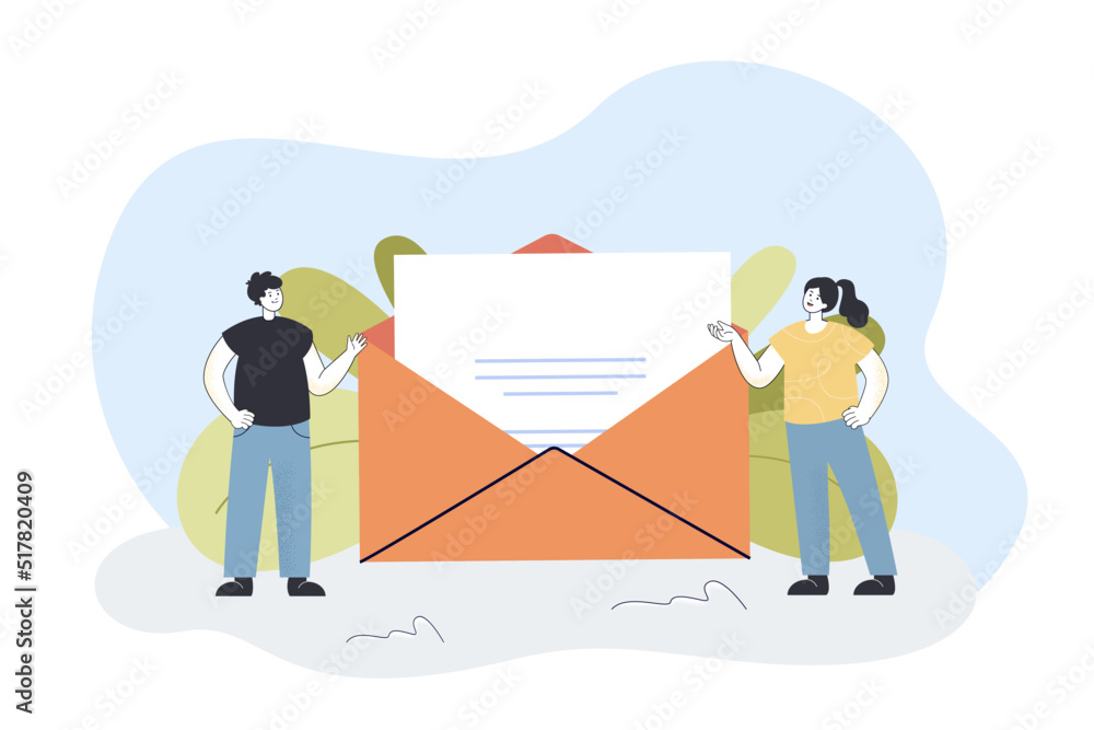 Wall mural man and woman standing next to huge open envelope with paper. characters talking via letters or e-ma - Wall murals Wall mural man and woman standing next to huge open envelope with paper. characters talking via letters or e-ma - Wall murals