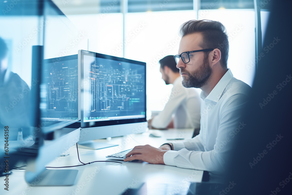 Wall mural man at computer, software developer working on coding script or cyber security in bright modern offi - Wall murals Wall mural man at computer, software developer working on coding script or cyber security in bright modern offi - Wall murals
