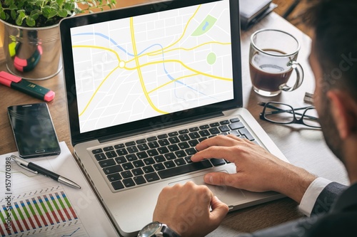 The watermark will not be included on Wall mural.: Man at work with a laptop - map on the computer screen