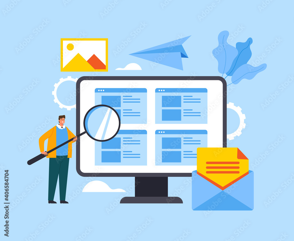 Wall mural man character holding magnifier and searching information by internet online website. vector concept - Wall murals Wall mural man character holding magnifier and searching information by internet online website. vector concept - Wall murals