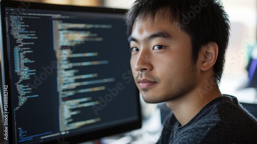 Wall mural : Man coding on computer screen displaying code in office setting during day