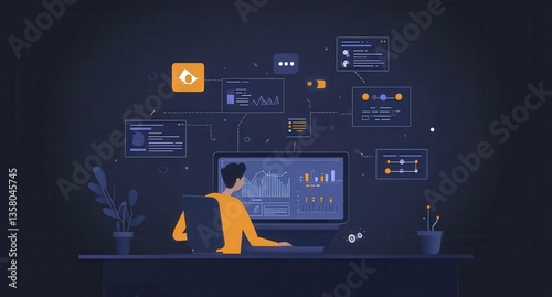 Wall mural : Man engaged with advanced data interfaces in a modern technological environment