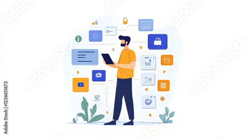 Wall mural : Man engaging with digital tools and analytics in a modern workspace -