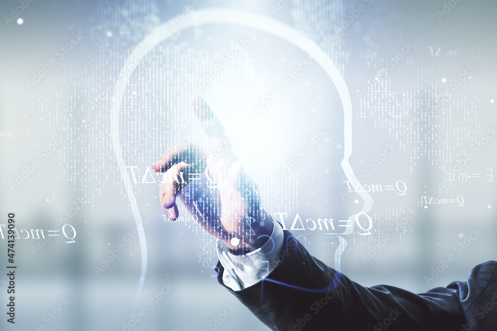 The watermark will not be included on Wall mural.: Man hand clicks on abstract virtual artificial intelligence concept with human head sketch on blurre
