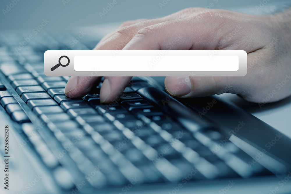 Wall mural man hand typing on keyboard with seach button. - Wall murals Wall mural man hand typing on keyboard with seach button. - Wall murals