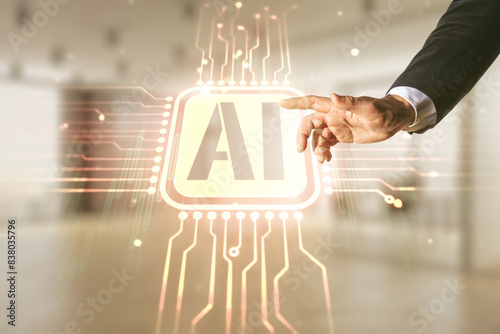 Wall mural man hand working with abstract virtual artificial intelligence symbol hologram on blurred office bac