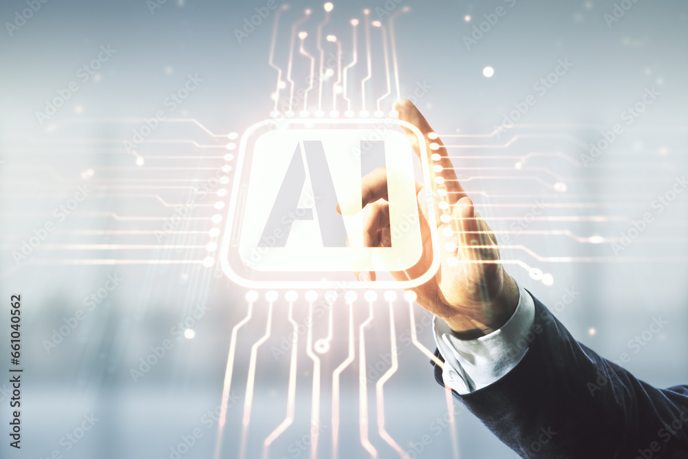 Wall mural man hand working with abstract virtual artificial intelligence symbol hologram on blurred office bac
