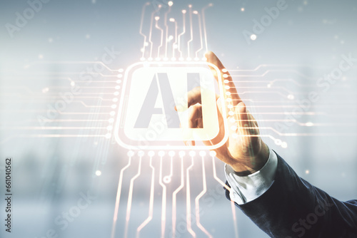 Wall mural : Man hand working with abstract virtual artificial intelligence symbol hologram on blurred office bac