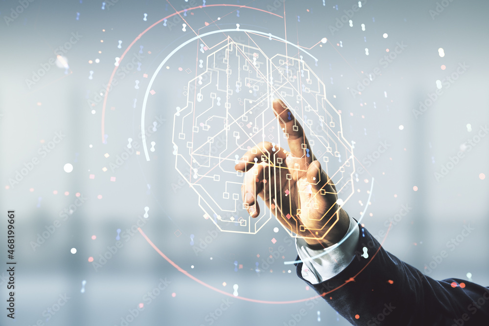 Wall mural man hand working with virtual creative artificial intelligence hologram with human brain sketch on b - Wall murals Wall mural man hand working with virtual creative artificial intelligence hologram with human brain sketch on b - Wall murals