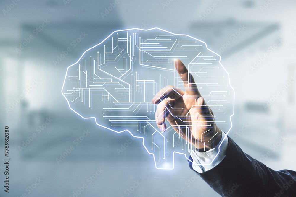Wall mural man hand working with virtual creative artificial intelligence hologram with human brain sketch on b - Wall murals Wall mural man hand working with virtual creative artificial intelligence hologram with human brain sketch on b - Wall murals