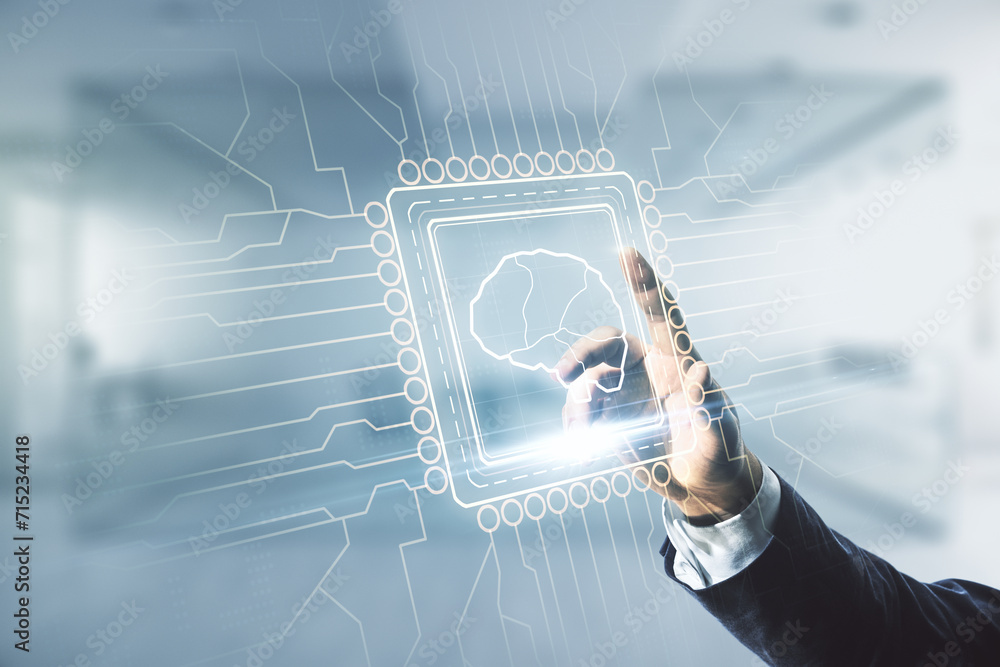 Wall mural man hand working with virtual creative artificial intelligence hologram with human brain sketch on b - Wall murals Wall mural man hand working with virtual creative artificial intelligence hologram with human brain sketch on b - Wall murals
