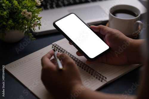 The watermark will not be included on Wall mural.: Man hands holding smart phone with blank screen for your text message or information content -