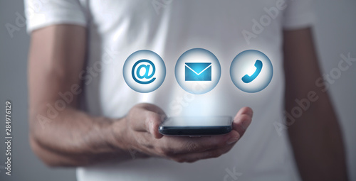 The watermark will not be included on Wall mural.: Man holding smartphone with contact symbols -