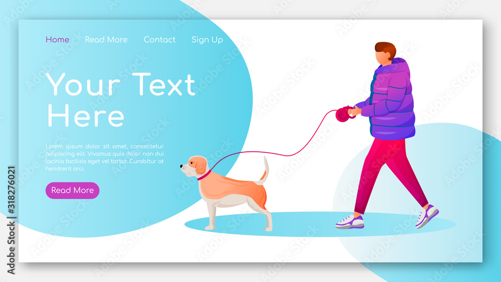 Man in coat landing page flat color vector template - caucasian guy walking dog homepage layout - rainWall mural