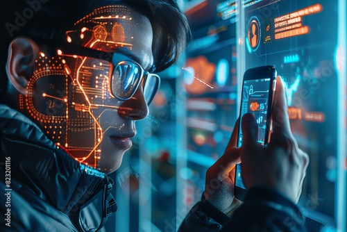The watermark will not be included on Wall mural.: Man in glasses using smartphone with futuristic interface