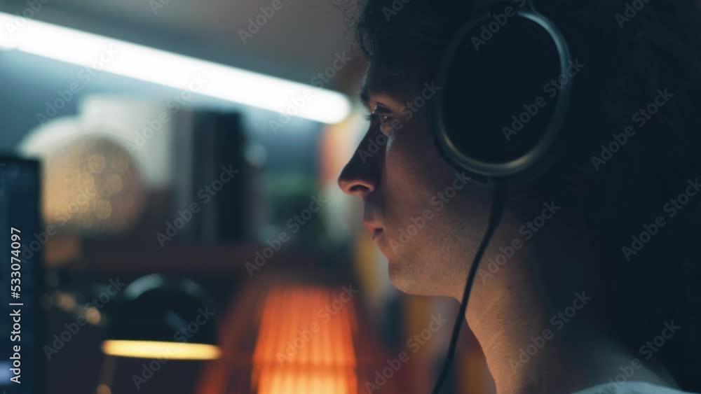 The watermark will not be included on Wall mural.: Man in headphones browsing the internet and social networks on computer at home at night and listeni