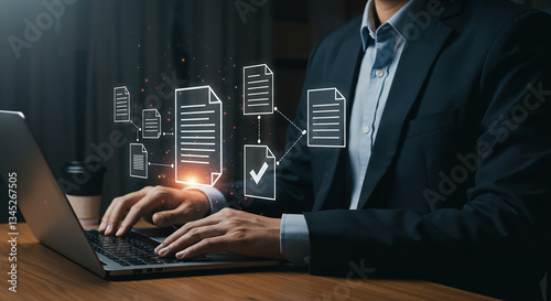 Wall mural : Man in suit typing on laptop with document icons floating above keyboard on wooden table surface