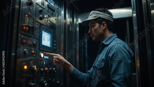 The watermark will not be included on Wall mural.: Man operating elevator panel, inside an elevator with control panel and screen displays