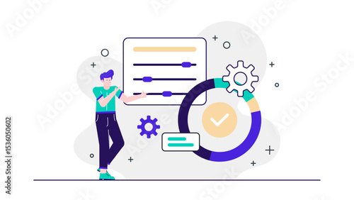 Wall mural man pointing to settings menu with gear. suitable for technology concepts, digital devices, software - Wall murals Wall mural man pointing to settings menu with gear. suitable for technology concepts, digital devices, software - Wall murals