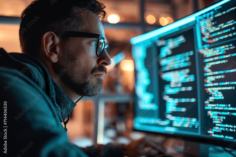 Wall mural man programmer code on computer screen with cybersecurity hologram - Wall murals Wall mural man programmer code on computer screen with cybersecurity hologram - Wall murals