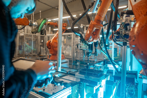 The watermark will not be included on Wall mural.: Man programming robot in automotive industrial, professional programmer, industry concept