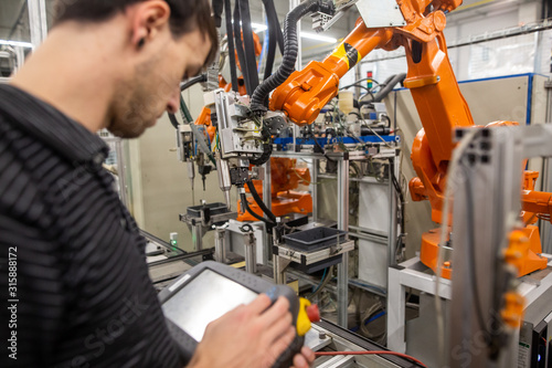 The watermark will not be included on Wall mural.: Man programming robot in automotive industrial, professional programmer, industry concept