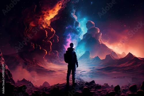 Wall mural man silhouette standing on futuristic planet surface and looking on cosmic landscape with nebula and