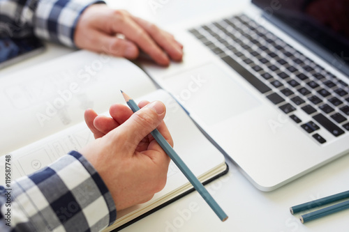 The watermark will not be included on Wall mural.: Man sketching graphic design for a new website
