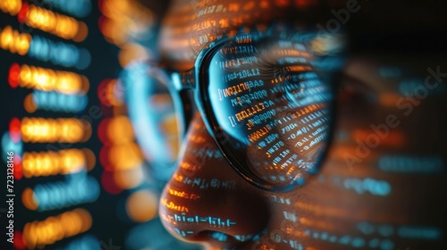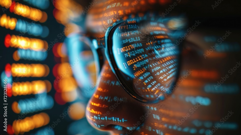 Wall mural : Man spectacles, extreme close up, focused developer coder looking at programming code data cyber sec