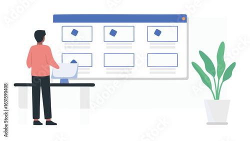 Wall mural man standing in front of a screen displaying a grid of images with a plant on the side wall