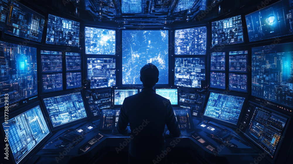 The watermark will not be included on Wall mural.: Man stands in front of multiple glowing screens, immersed in futuristic digital environment - screens