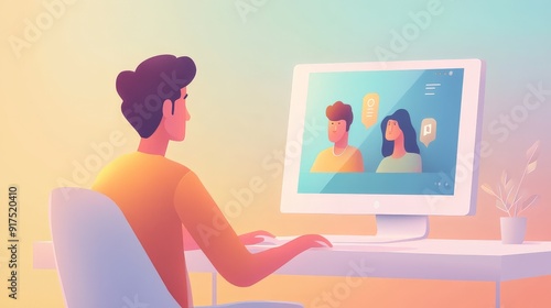The watermark will not be included on Wall mural.: Man using a desktop computer with a screen showing three people