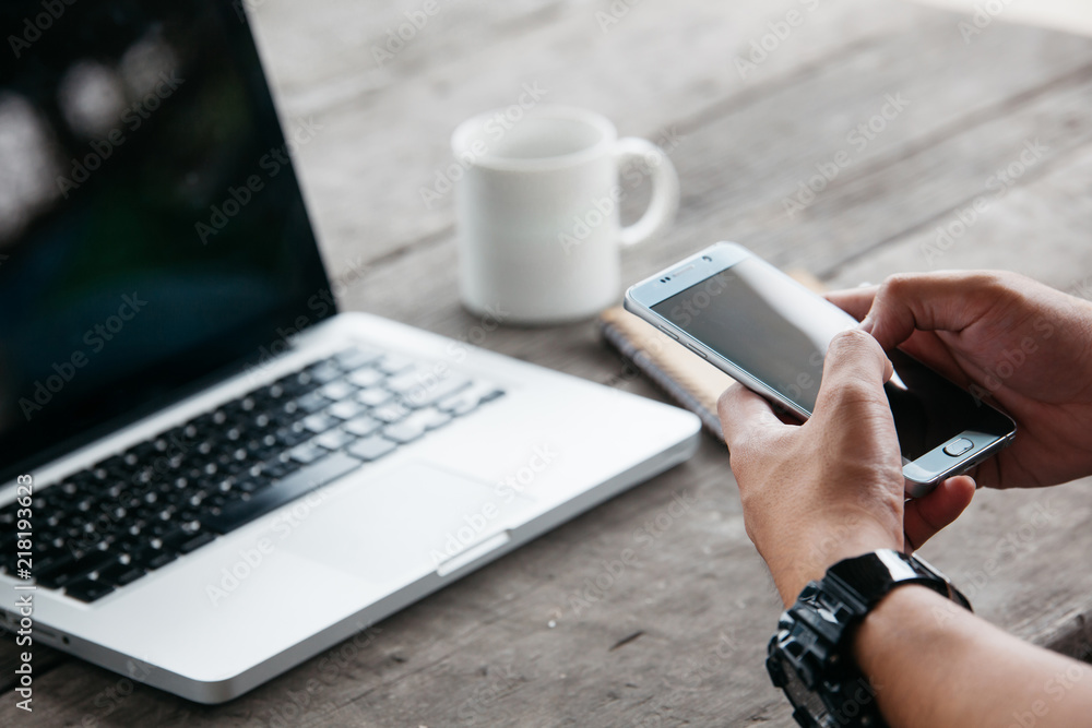The watermark will not be included on Wall mural.: Man using internet on smart phone and laptop