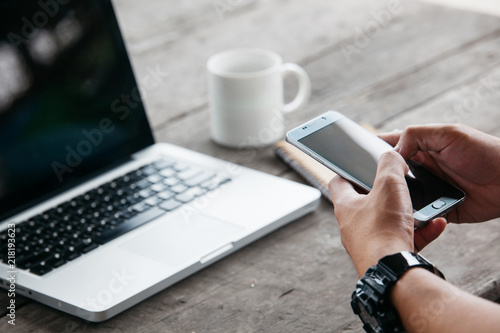 Wall mural : Man using internet on smart phone and laptop