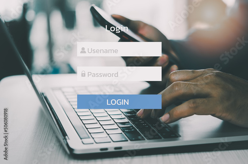 The watermark will not be included on Wall mural.: Man using laptop computer and sign up or log in username password virtual touch screen -