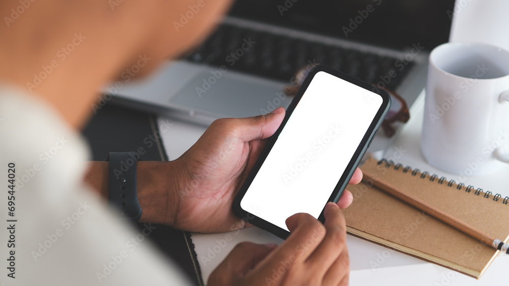Wall mural man using smart phone while sitting front of laptop at office desk. over shoulder view.