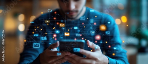 Wall mural : Man using smartphone with social media icons hovering around him -