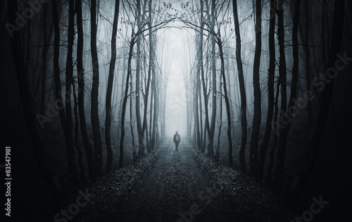 Wall mural man walking on path in strange dark forest with fog - Wall murals Wall mural man walking on path in strange dark forest with fog - Wall murals