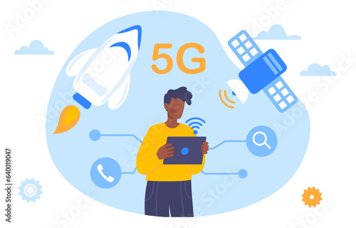 Wall mural man with 5g concept. young guy with tabet at background of satellite and rocket. mobile internet and