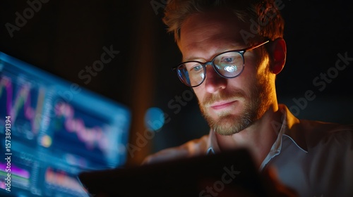 The watermark will not be included on Wall mural.: Man with glasses looking at screens displaying graphs in a dark environment at night time