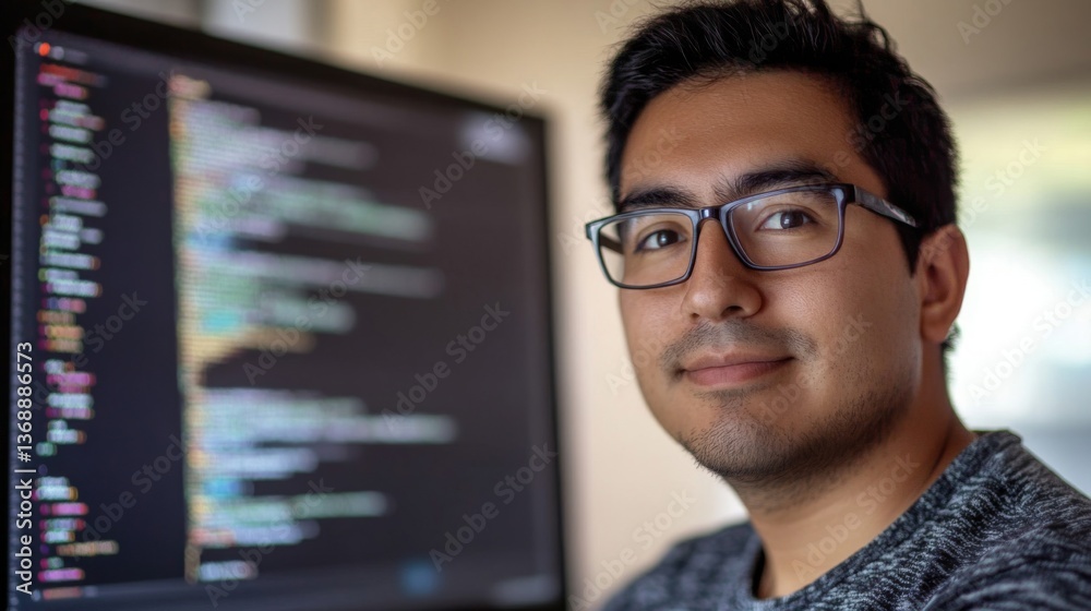 The watermark will not be included on Wall mural.: Man with glasses works with software code on computer screen indoors