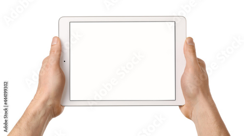 The watermark will not be included on Wall mural.: Man with tablet computer on white background