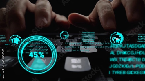 Wall mural : Man working on laptop computer keyboard with graphic user interface gui hologram showing concepts of