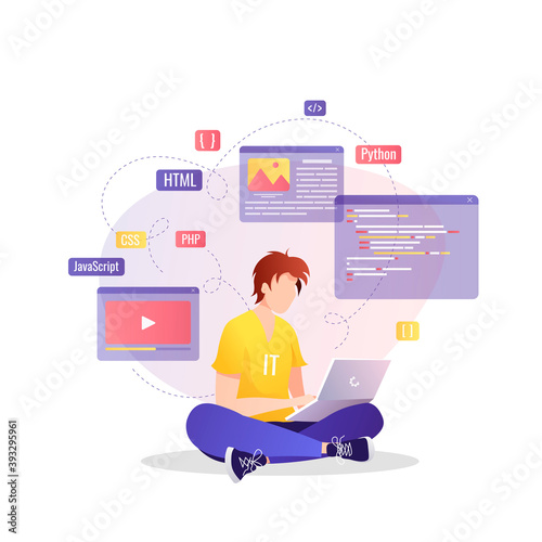 Wall mural man working with laptop on the website development. website developer, web agency, programmer and co