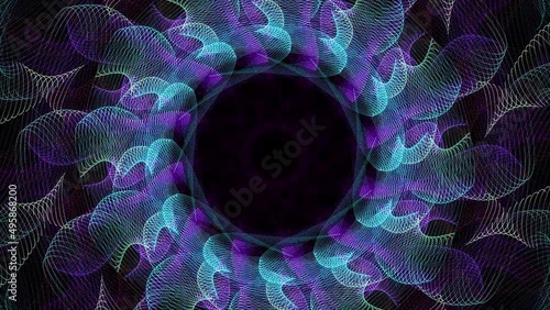 The watermark will not be included on Wall mural.: Mandala style kaleidoscopic pattern of particles appears and rotates on black background then fades