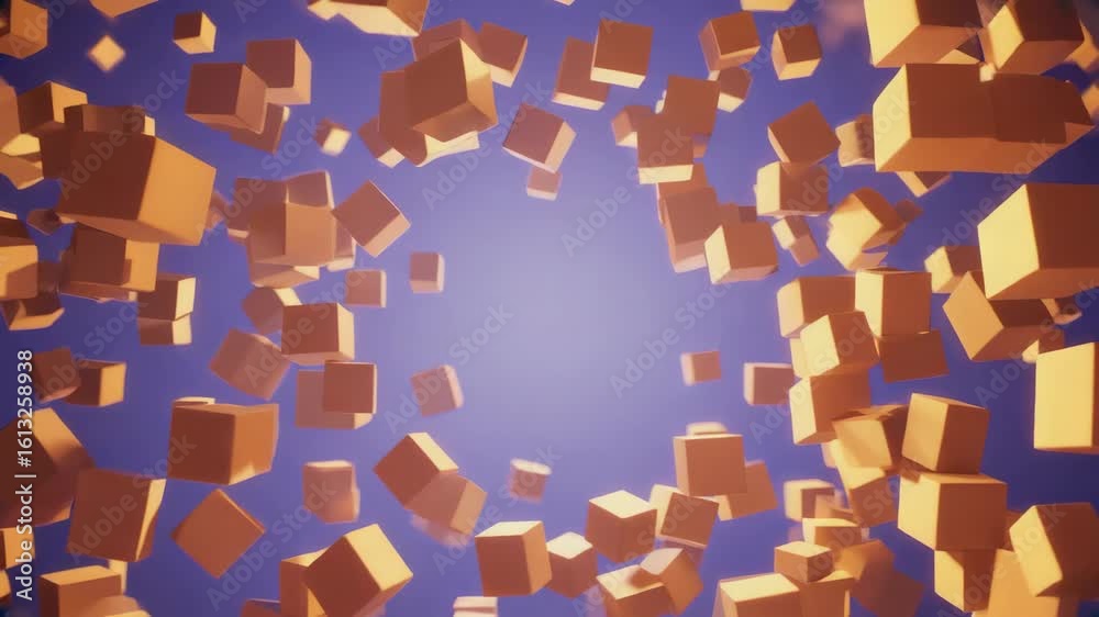 The watermark will not be included on Wall mural.: Many orange cubes are floating on a purple background, creating an empty space in the center, sugges