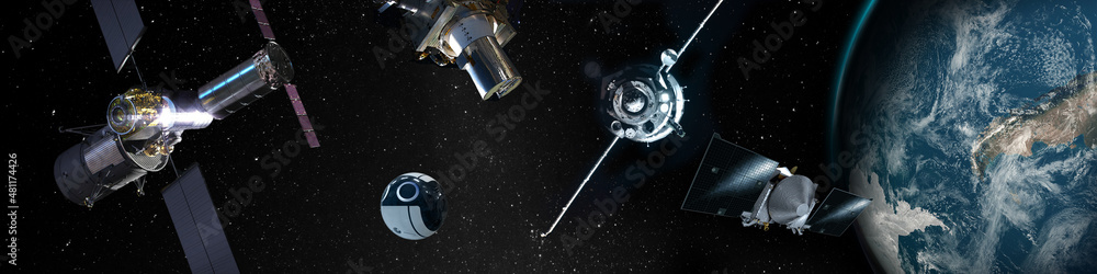 Wall mural many spaceships of various shapes in space above the planet earth. elements of this image furnished